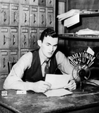 Left: Jack Drees reads sports headlines. Drees, a UI basketball player in the 1930s, went on to do play-by-play radio coverage of the Chicago White Sox and eventually became a sportscaster for CBS Television.